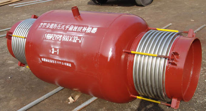 分為單式旁通壓力平衡式波紋膨脹節和復式旁通壓力平衡式波紋膨脹節,采用同一種規格的波紋管,體積小、成本低、導向性好,穩定性好。主要用于吸收軸向位移并能平衡波紋管的壓力推力,內壓推力載荷由自身構件平衡、承受,用于不允許有較大推力的場合。該補償器主要用于補償管系的軸向位移,不能吸收橫向及角向位移,一組波紋管承受內壓,一組波紋管承受外壓。介質通過一組波紋管流向另一端管內,介質流向走曲線,因此補償器流阻較大,適用于介質壓力高、密度低、流速不太高且固定支架設置不易的直線管系。該補償器具有補償量大,無內壓推力等優點,但價格較高,建議在同一管線不要過多安裝此補償器。