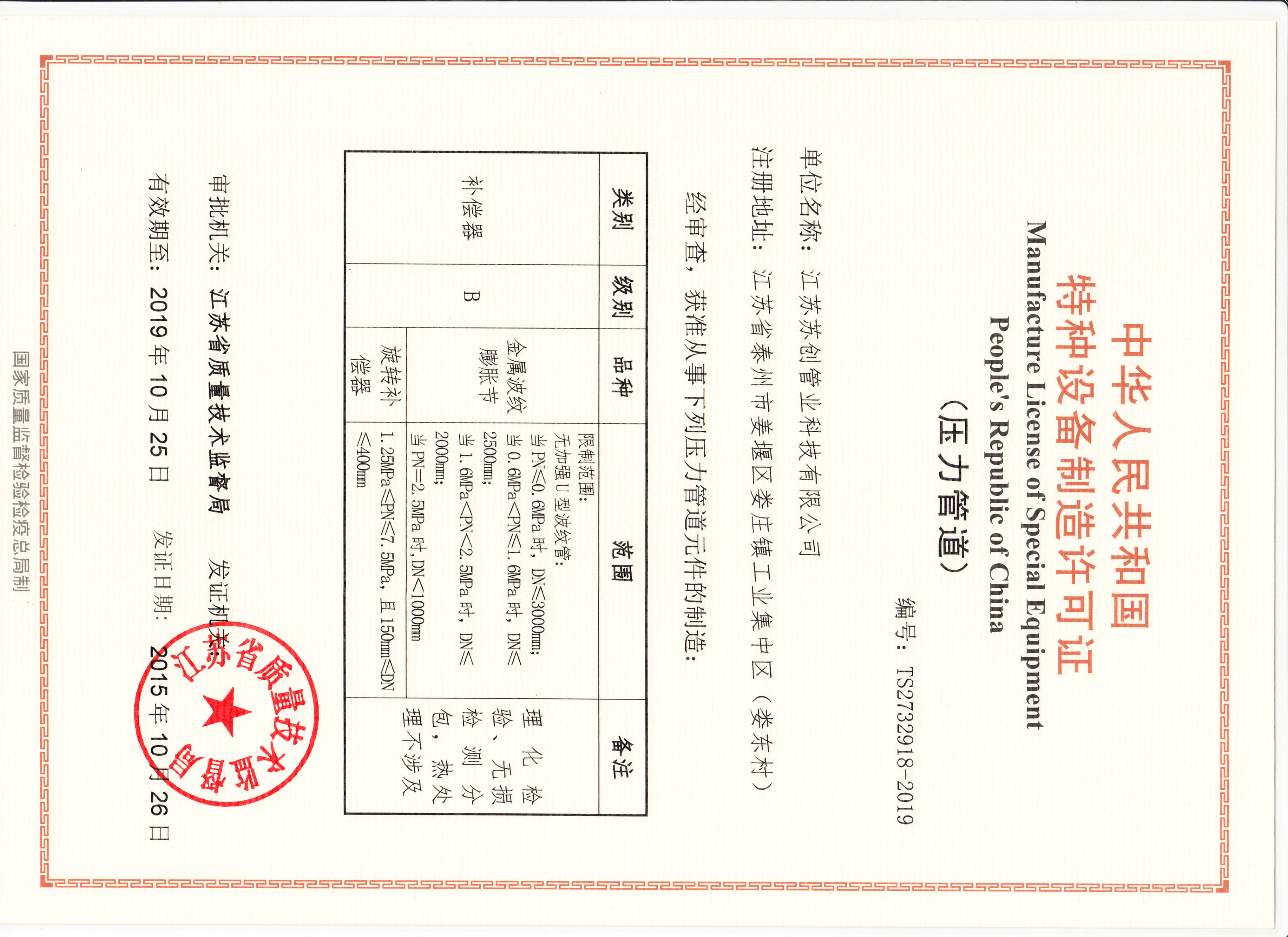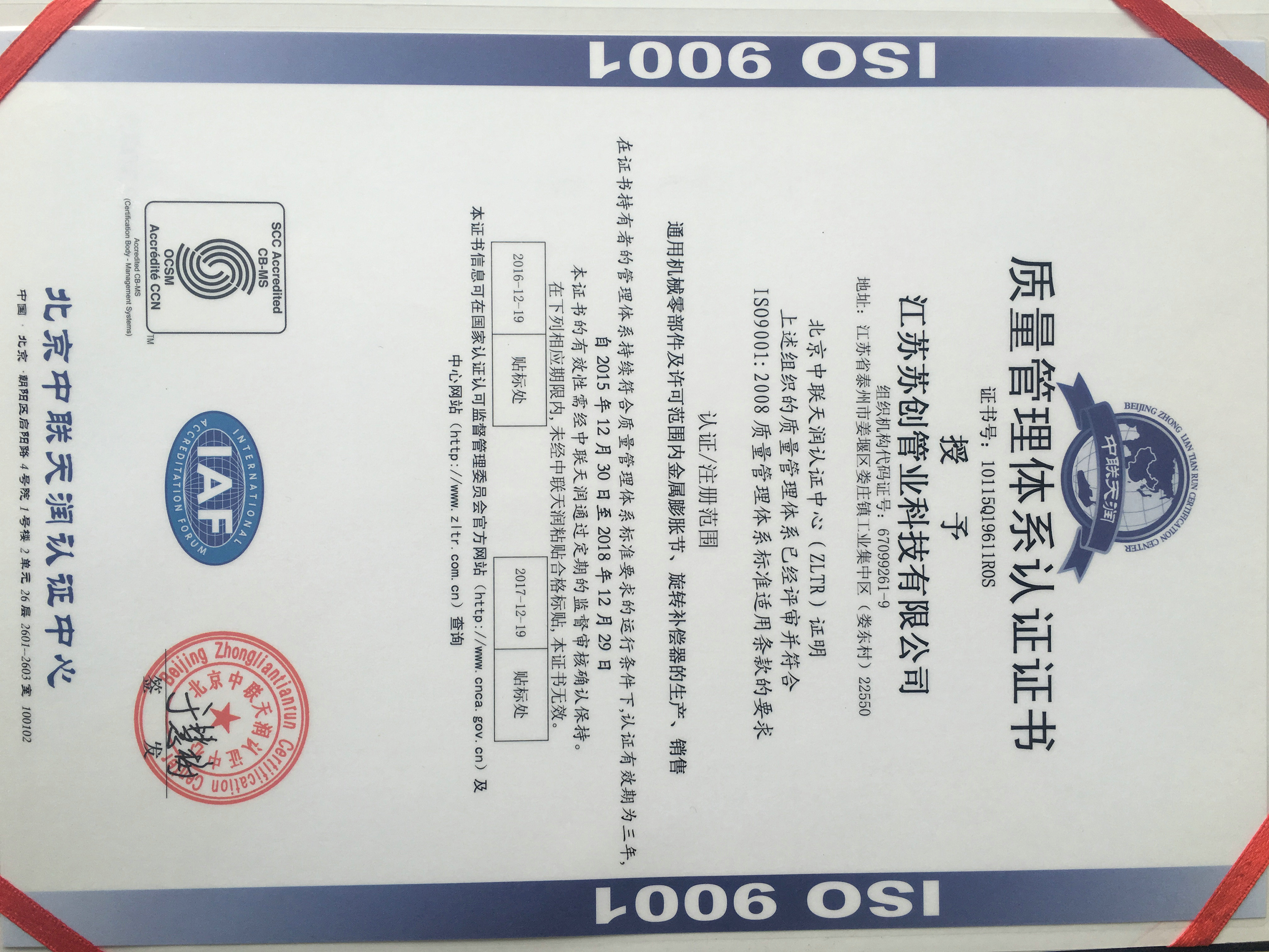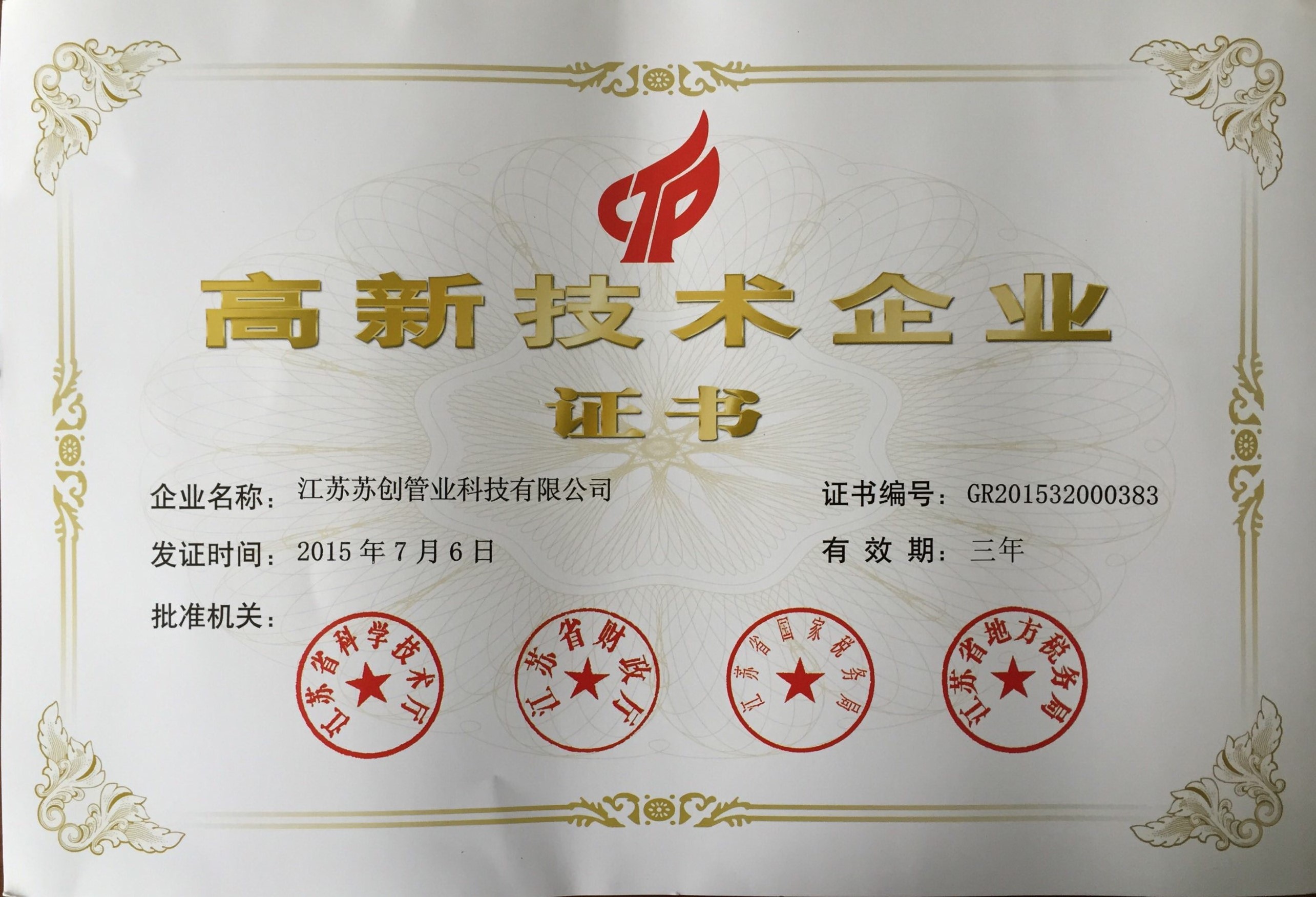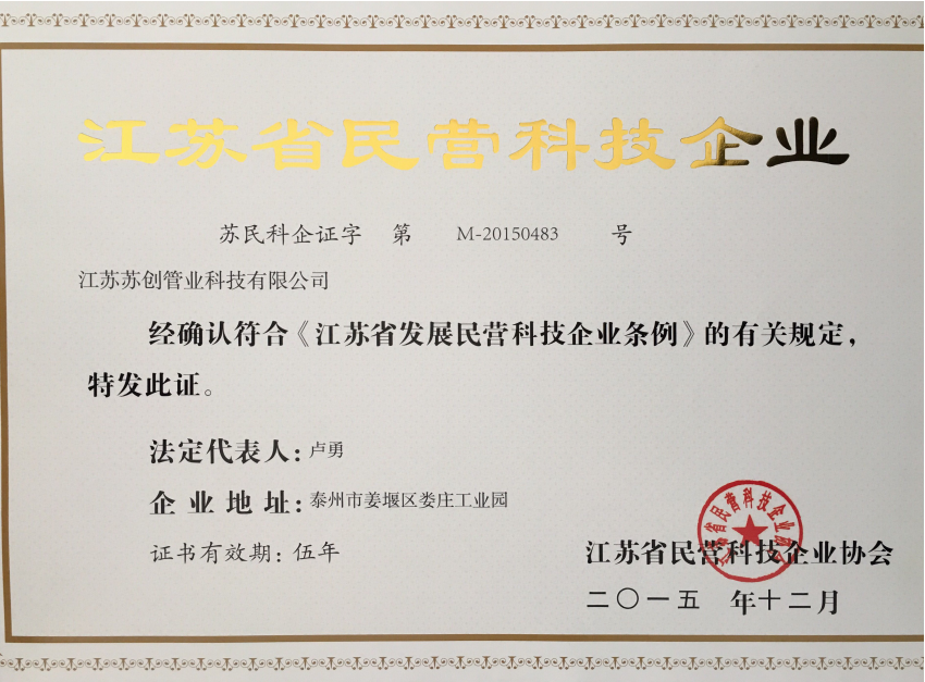 蘇創通過ISO9001-2008質量體系認證蘇創通過壓力管道元件許可證蘇創榮獲高新技術企業、民營科技企業等榮譽